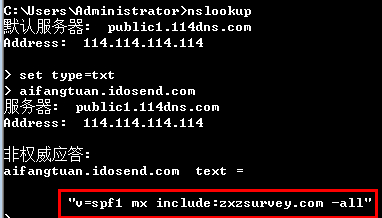 如果显示 "v=spf1 mx include:zxzsurvey.com -all",说明已经生效,如图所示:
